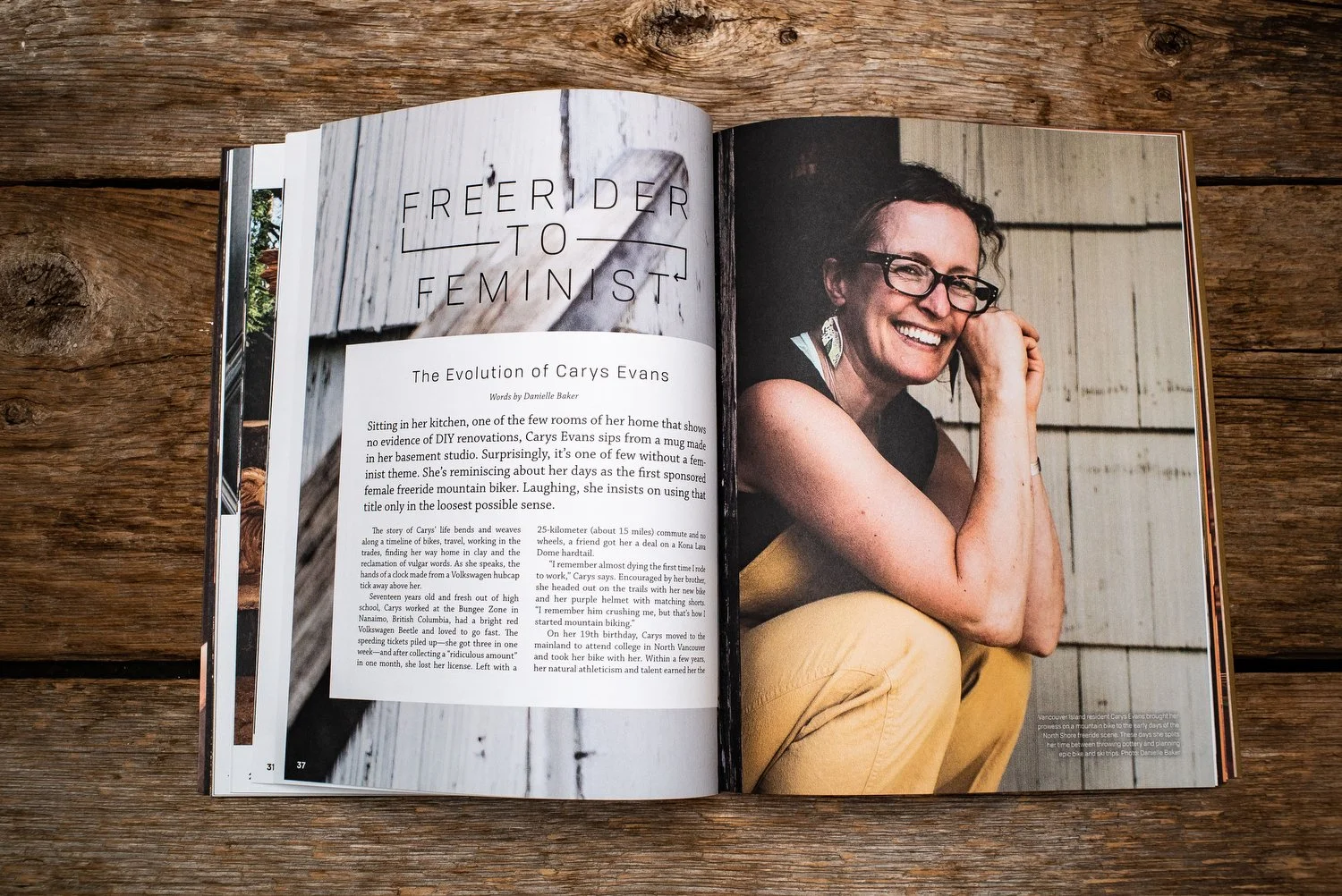 Surprisingly, it’s one of few without a feminist theme. She’s reminiscing about her days as the first sponsored female freeride mountain biker. Laughing, she insists on using that title only in the loosest possible sense.